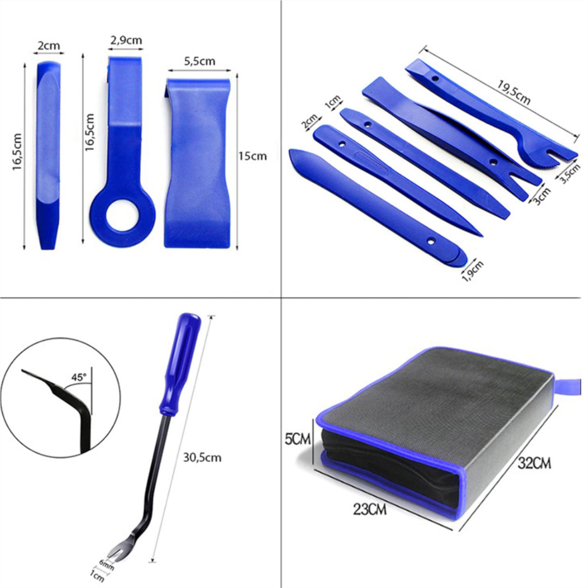 El kit extractor de tapicería y clips de radio es un juego especializado para retirar tapicería, clips y molduras de automóviles . También es muy útil para retirar radios, indicadores y equipos electrónicos con clips. Los extractores están hechos de plástico duradero y de alta calidad , lo que garantiza que no dañarán los bordes de la tapicería durante el desmontaje, preservando así la estética del interior de su vehículo.