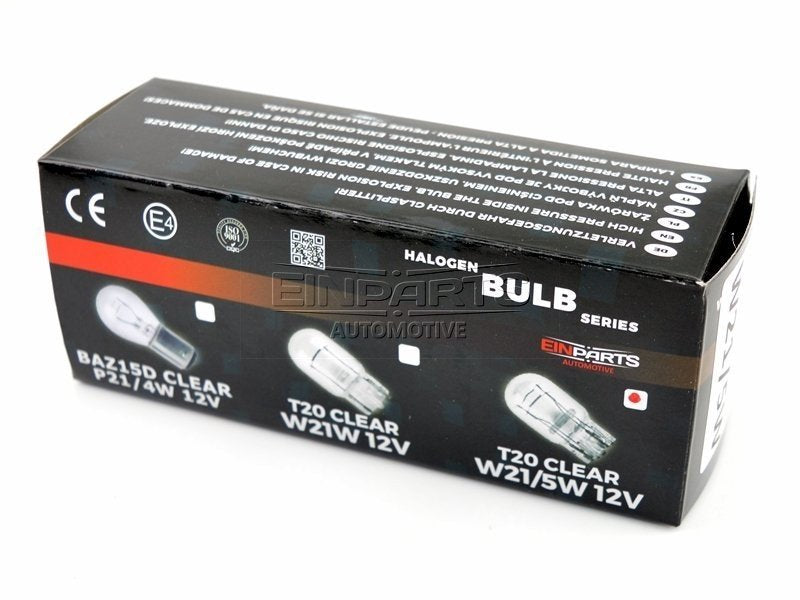 Especificación: Tipo de bombilla: W21/5W Potencia : - W Aprobación: E4 Temperatura de color: amarillo (luz natural) Tamaño: - mm x - mm (largo x ancho) Voltaje: 12 voltios Contenido del paquete: 1 bombillaBombilla halógena T20 W21/5W 12V Einparts