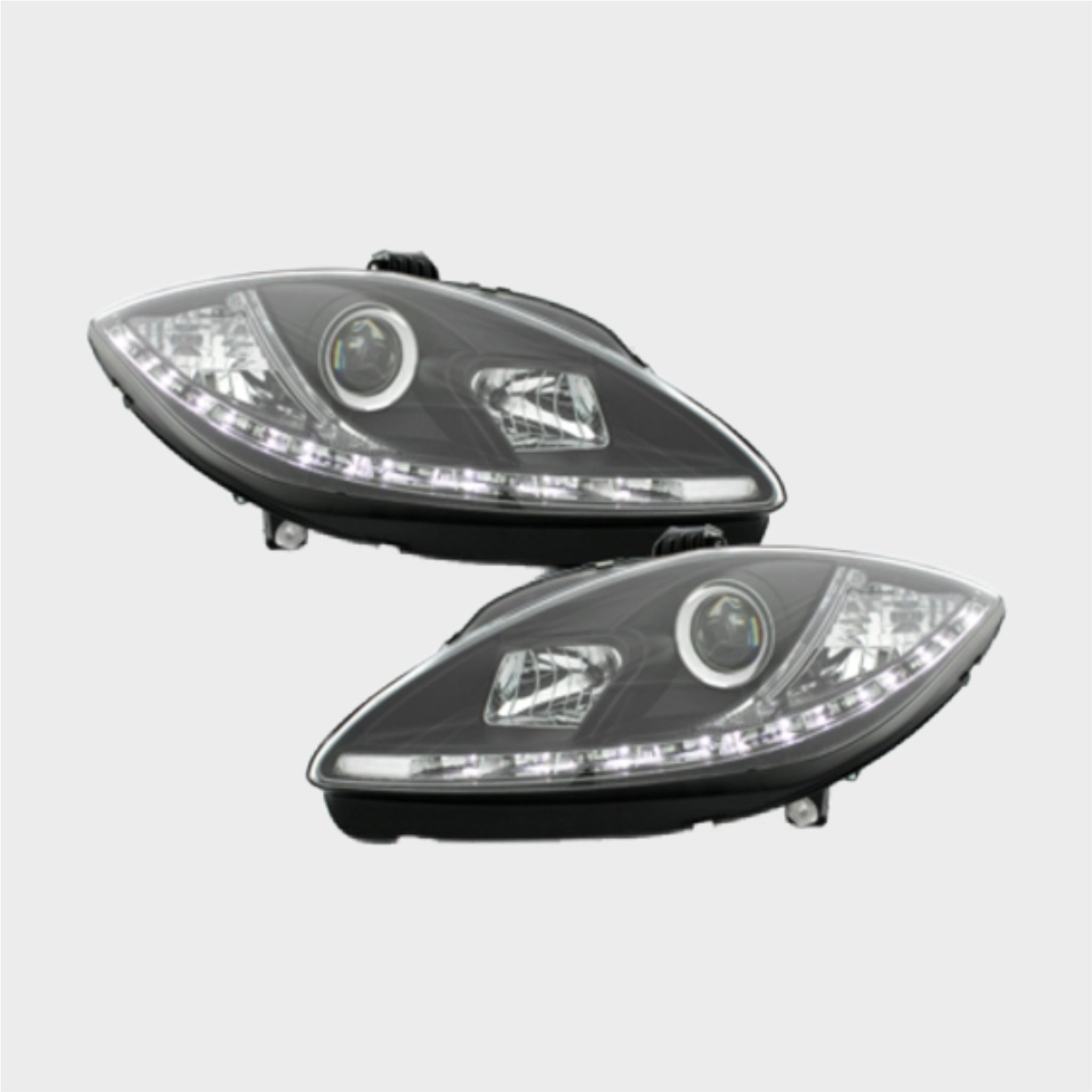 Este Par de faros LED con DRL integrado Ofrece una actualización estética y funcional para los modelos. Seat León 1P, Altea y Altea XL (2009 en adelante) , que combina la moderna tecnología de iluminación con un diseño deportivo en acabado negro.